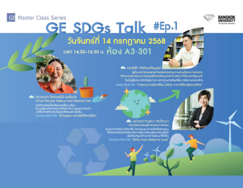 การบรรยายเป้าหมายการพัฒนาที่ยั่งยืน SDGs จัดในรายวิชา GE เพื่อให้ความรู้ สร้างแรงบันดาลใจ และกระตุ้นให้ผู้เข้าร่วมตระหนักถึงความยั่งยืน โดย ดร.ธัชไท กีรติพงค์ไพบูลย์, ผศ.ดร.กาญจนา ส่งวัฒนา และคุณอมตา จิตตะเสนีย์ เมื่อวันที่ 14 กรกฎาคม 2568